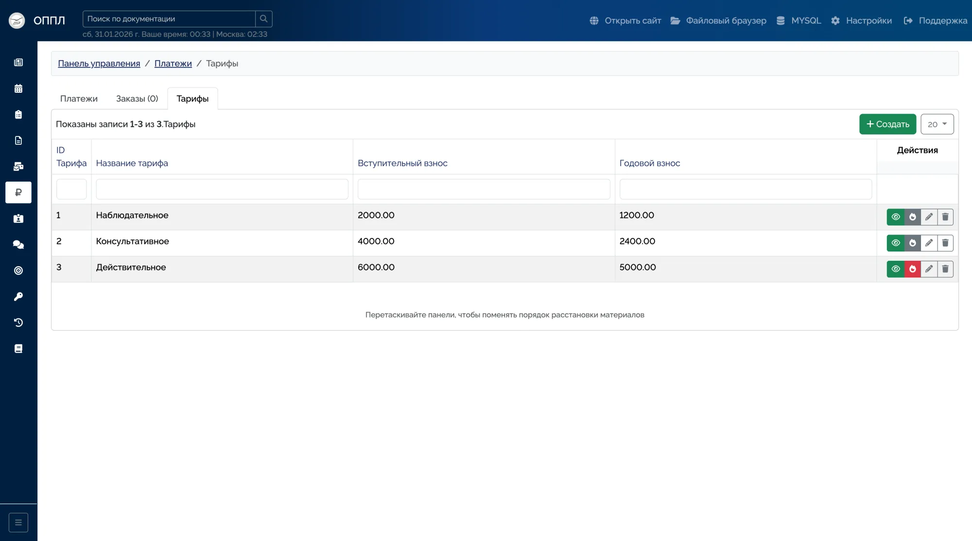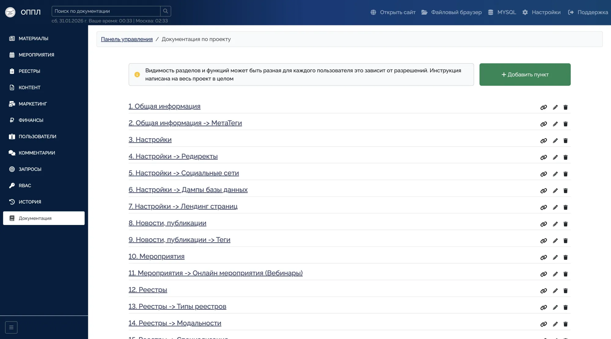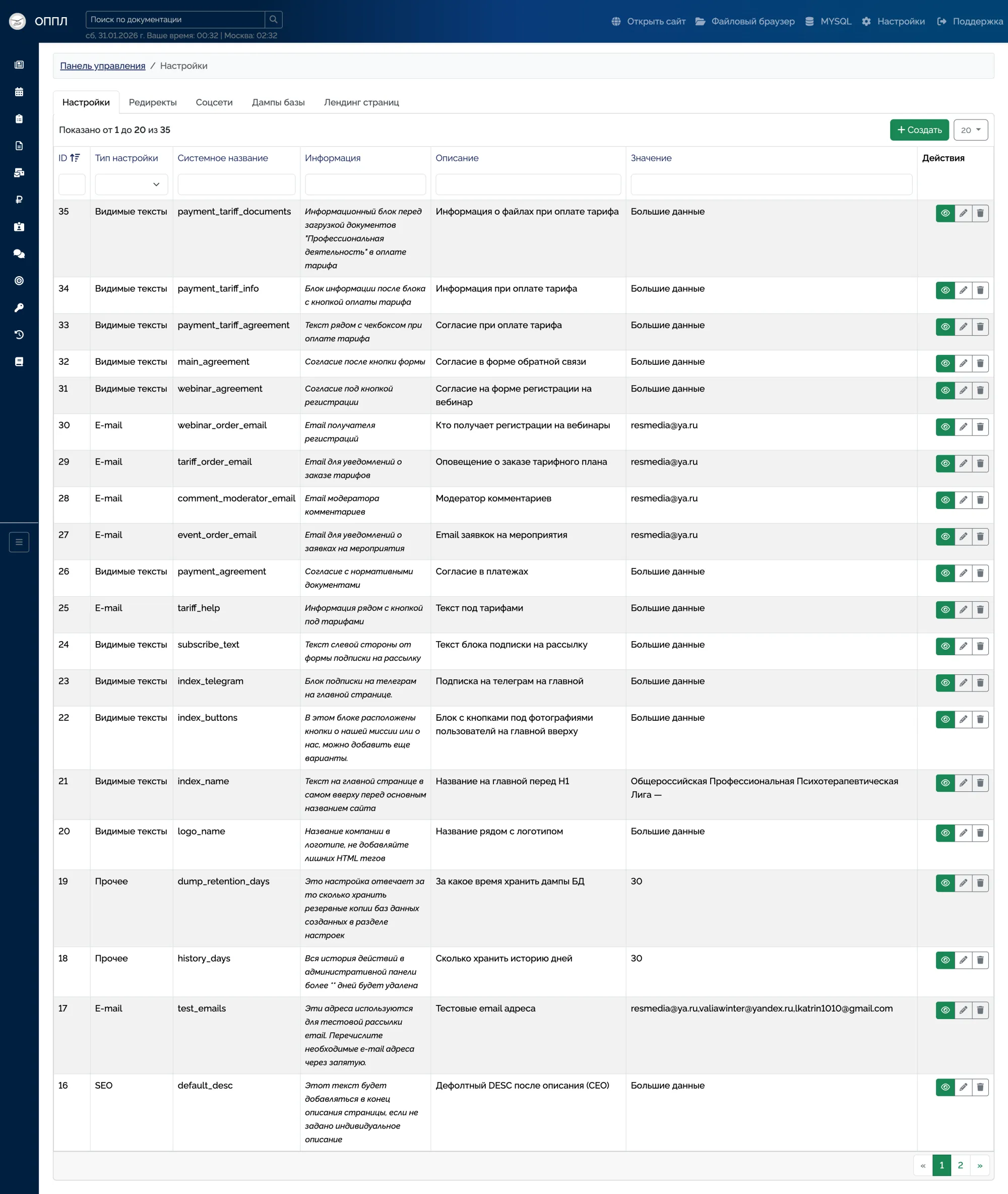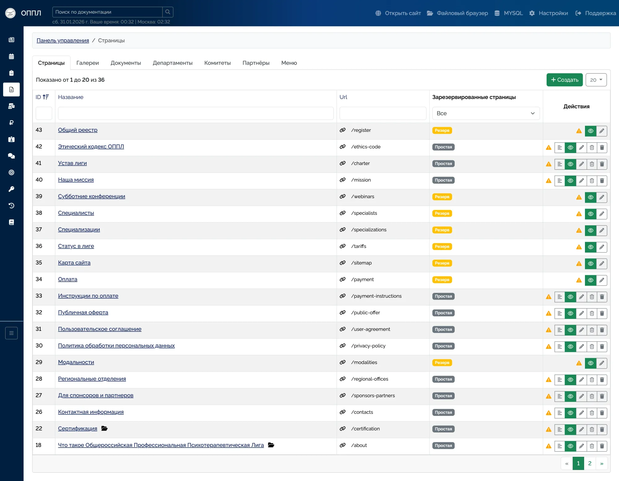 Полный CRUD для всех сущностей сайта: новости, публикации, мероприятия, реестры, пользователи, тарифы, документы, галереи.