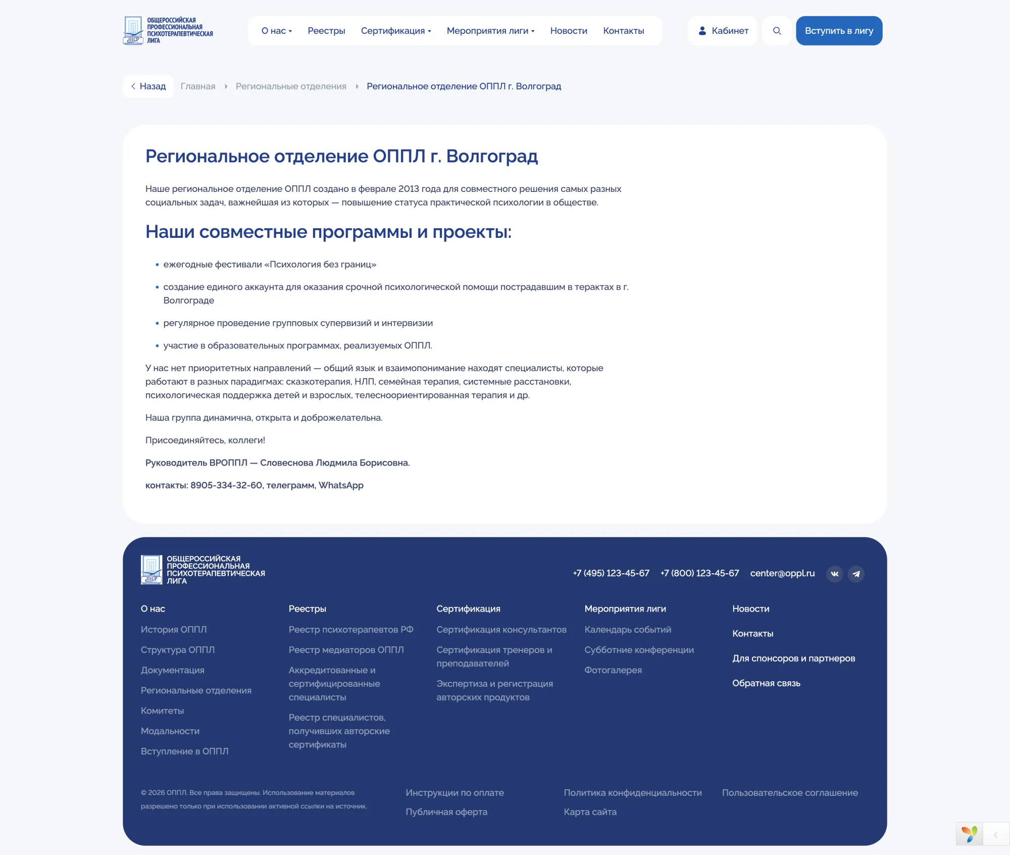 Главная страница с динамическими блоками: события, новости, научные публикации, карта региональных отделений, партнёры.
